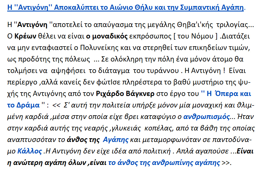 Ρ. ΒΑΓΚΝΕΡ : » Από τα βάθη της καρδιάς τής Αντιγόνης αναπτύσσεται το άνθος της Αγάπης και μεταμορφώνεται σε παντοδύναμο Κάλλος .Η Αντιγόνη απλά αγαπούσε με την ανώτερη αγάπη όλων ,που είναι το άνθος της ανθρωπίνης αγάπης».