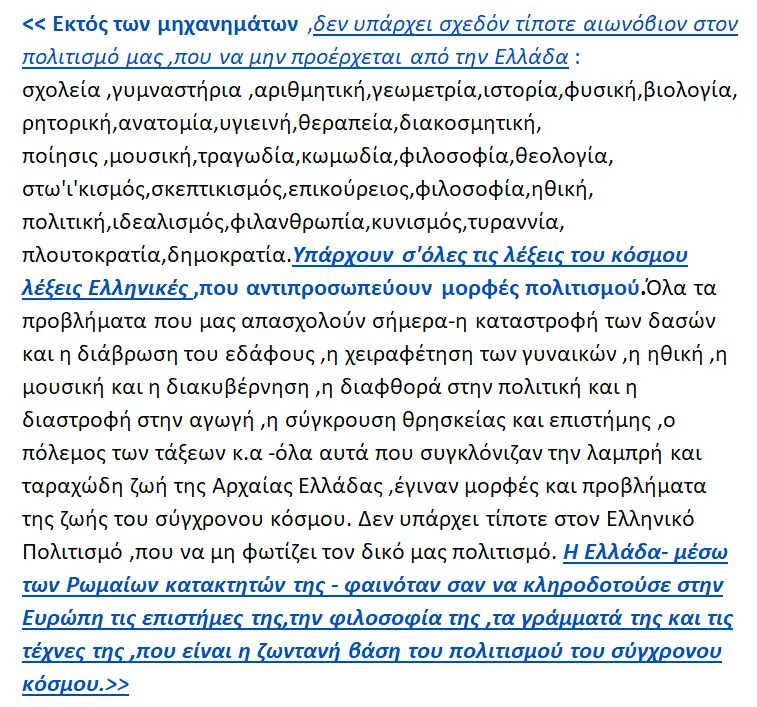 Εκτός των μηχανημάτων ,δεν υπάρχει σχεδόν τίποτε αιωνόβιο στον πολιτισμό μας, που να μην προέρχεται από την Ελλάδα .