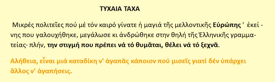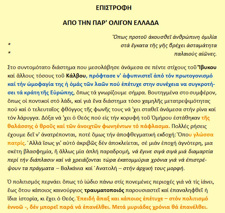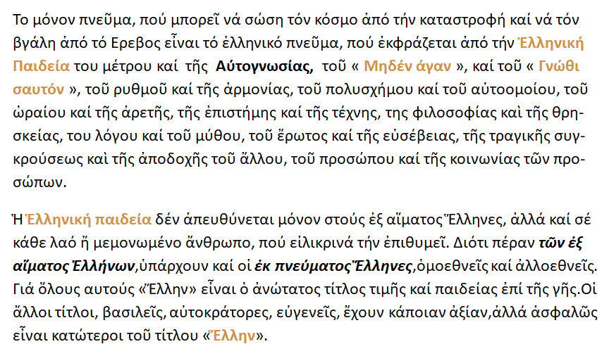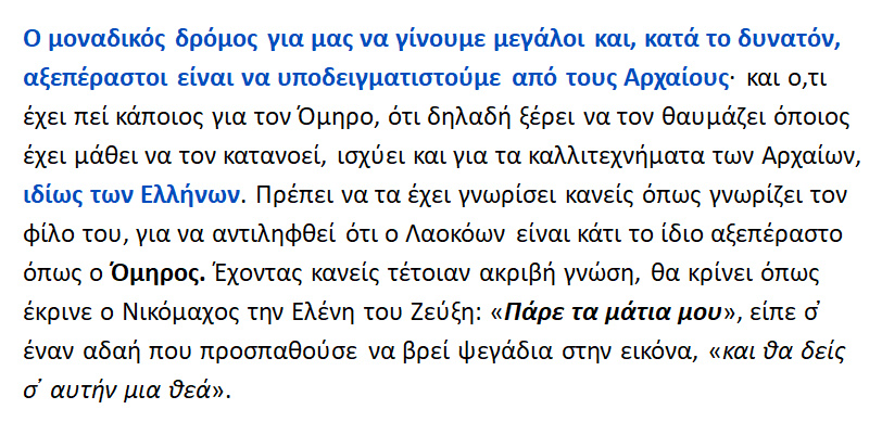 Η αίσθηση του ωραίου [ κάλλους ] ,που διαρκώς περισσότερο απλώνεται στον κόσμο ,άρχισε να διαμορφώνεται για πρώτη φορά κάτω από τον ελληνικό ουρανό { σελ.7-8 }