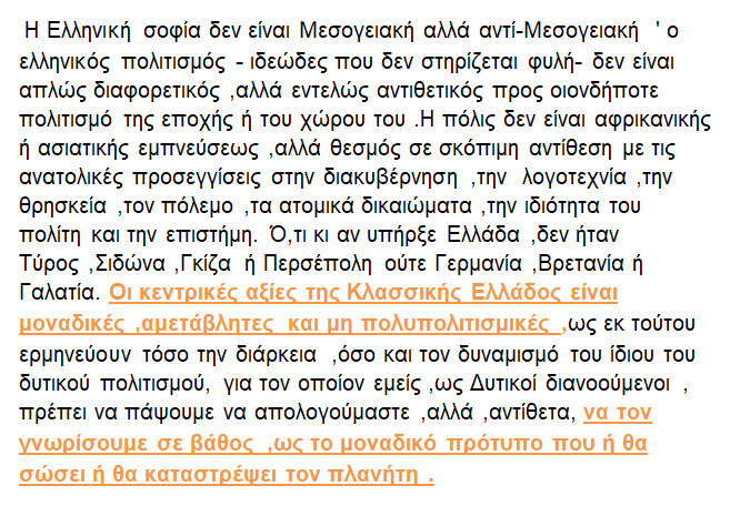 Ό,τι κι αν υπήρξε Ελλάδα ,δεν ήταν  Τύρος , Σιδώνα ,Γκίζα  ή  Περσέπολη ,ούτε Γερμανία, Βρετανία ή Γαλατία.  Οι κεντρικές αξίες της Κλασσικής Ελλάδος είναι  : μοναδικές ,αμετάβλητες  και μη πολυπολιτισμικές .Ως εκ τούτου ερμηνεύουν τόσο την διάρκεια  ,όσο και τον δυναμισμό του ίδιου του δυτικού πολιτισμού, για τον οποίον εμείς, ως Δυτικοί διανοούμενοι , πρέπει να πάψουμε να απολογού-μαστε ,αλλά ,αντίθετα, να τον γνωρίσουμε  σε βάθος,   ως το μοναδικό πρότυπο που ή θα σώσει ή θα καταστρέψει τον πλανήτη .