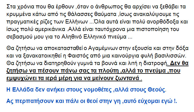 Δεν θα ζητήσω να πέσουν πάνω σας τα πλούτη ,αλλά το πνεύμα ,που εμψυχώνει τα ιερά μέρη για να μείνουν ζωντανά …Η Ελλάδα δεν ανήκει στους νομοθέτες ,αλλά στους Θεούς. Ας περπατήσουν και πάλι οι θεοί στην γη ,αυτό εύχομαι εγώ !.