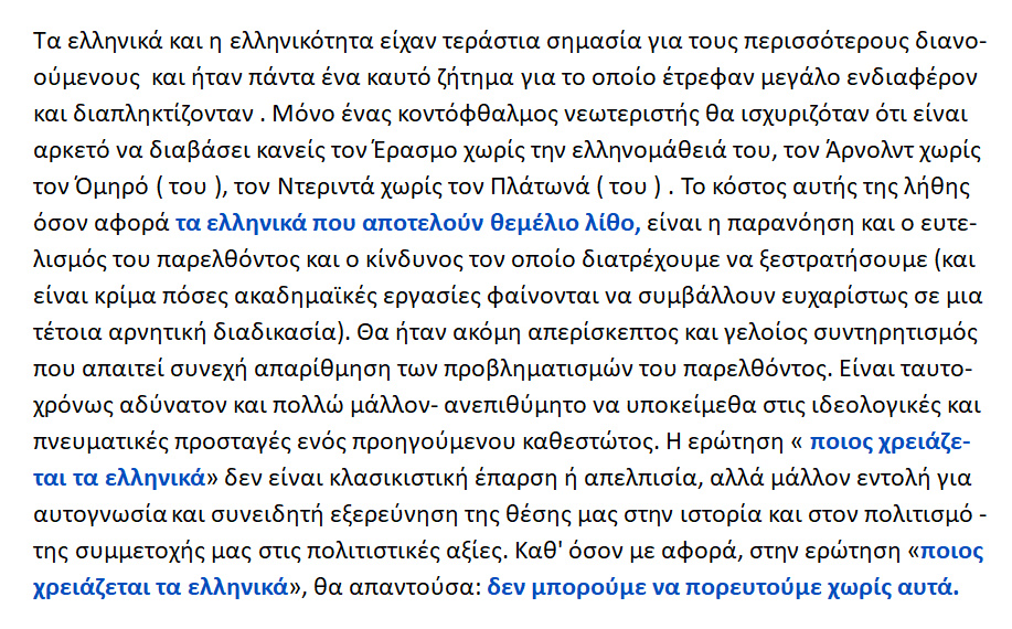 Η ερώτηση «ποιος χρειάζεται τα ελληνικά» δεν είναι κλασικιστική έπαρση ή απελπισία, αλλά μάλλον εντολή για αυτογνωσία και συνειδητή εξερεύνηση της θέσης μας στην ιστορία και στον πολιτισμό – της συμμετοχής μας στις πολιτιστικές αξίες.