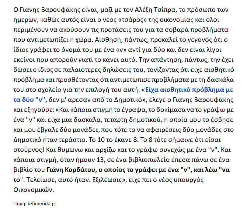 Μονομαχούν το τελευταίο διάστημα οι δύο Γιάν[ν]ηδες της Ελληνικής οικονομίας .Ο Γιάννης με τον Γιάνη. Ποιος από τους δυο έχει δίκιο ; Ο Γιάννης Σ. ή ο Γιάνης Β. ; Ποιος γράφει σωστά τ’ όνομά του ; » Γιατί ο κ. Βαρουφάκης λέγεται Γιάνης και όχι Γιάννης ; ‘‘ – » Το κουτί της Πανδώρας » μας δίνει την απάντηση του Γιάνη : Όλα ήσαν θέμα αισθητικής και ενός ψυχολογικού ,παιδικού τραύματος.
