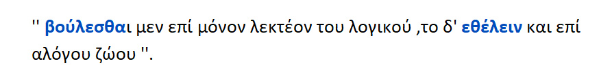 Το βούλομαι πρέπει να λέγεται μόνον για τα λογικά { βούληση έχουν μόνον οι άνθρωποι ,ως έλλογα ζώα ,διότι έχει σχέση με την βούλευση και την προαίρεση } ,ενώ το θέλω τίθεται και επί αλόγου ζώου.