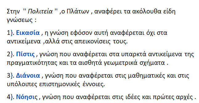 Τα είδη της γνώσεως είναι τέσσερα : εικασία , πίστις , διάνοια , νόησις .