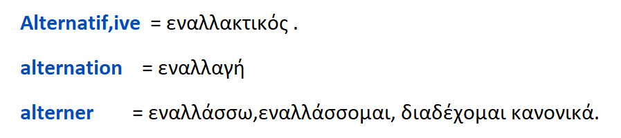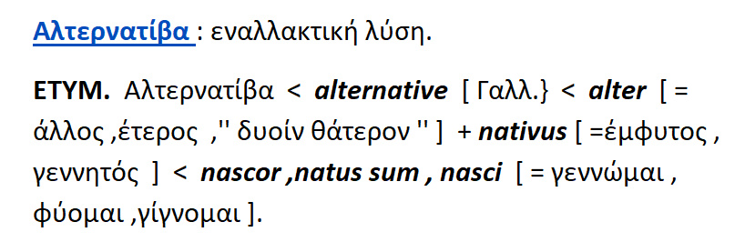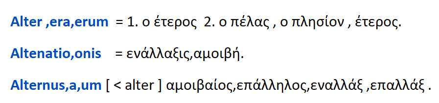 Στα Λατινικά το Alter ,era,erum = 1. ο έτερος 2. ο πέλας , ο πλησίον , έτερος. Συνεπώς δεν είναι γενικά ο άλλος , αλλά συγκεκριμένα από τους δύο ο έτερος. Άρα εναλλακτικός ,είναι αυτός που εντός του έχει δύο που διαδέχεται εναλλάξ το ένα το άλλο .