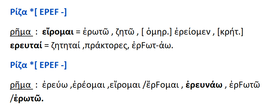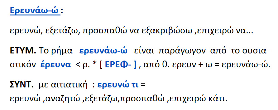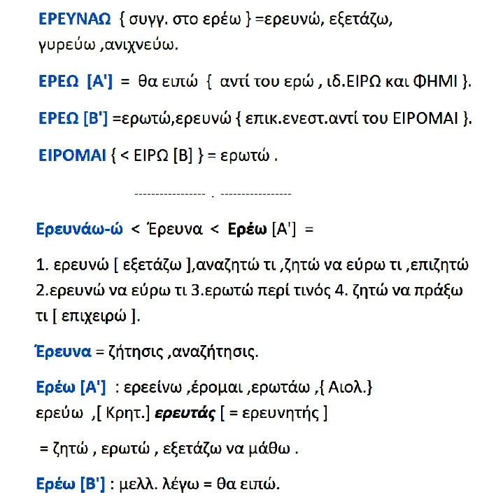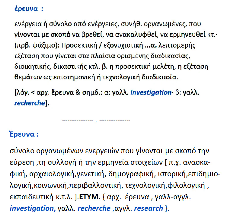 Η έρευνα στα φιλολογικά αρχίζει από τα λεξικά. Όπως είπε και ο Διδάσκαλος του Γένους Αδ. Κοραής : ‘‘Το πρώτο βιβλίο κάθε έθνους είναι το λεξικό της γλώσσας του ‘‘. Όμως ,ποία απ’ όλα τα λεξικά ; Η ελληνική γλώσσα είναι μία ,σε διάφορες μορφές ανάλογα με την χρονική περίοδο .Συνεπώς η έρευνα αρχίζει από τα Ομηρικά λεξικά , τα λεξικά των κλασσικών χρόνων , της Ελληνιστικής περιόδου , της Ρωμαϊκής , της Βυζαντινής ,τα νεώτερα μέχρι και τα σύγχρονα. Πραγματικά , Αληθινά Λεξικά είναι αυτά ,που έχουν και ετυμολογία. Μεγάλη σημασία εδώ έχει η ορθογραφία .Η ορθογραφία οδηγεί στην ετυμολογία και η ετυμολογία προϋποθέτει την ορθογραφία . Τούτα βοηθούν τον ερευνητή ,εάν έχει τις απαραίτητες γνώσεις , να ελέγξει το έτυμον της λέξεως που αναζητεί [ εν προκειμένω της λέξεως έρευνα ] .