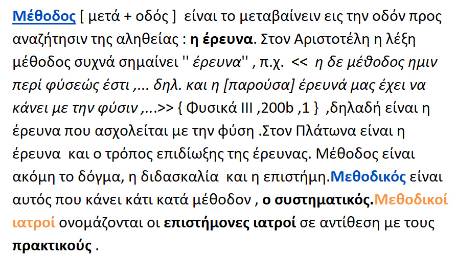 μέθοδος: (μετά + οδός ), αναζήτηση, επιδίωξη, κατάκτηση, [ ιδ.], κατάκτηση γνώσης, επιστημονική αναζήτηση, έρευνα, ερευνητική μέθοδος.
