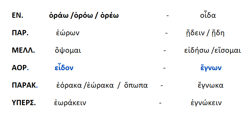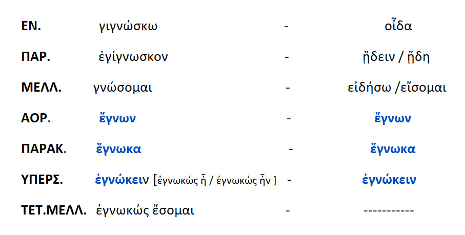 Το γιγνώσκω και το οίδα είναι και τα δύο ρήματα γνώσεως. Το οίδα ουσιαστικά είναι ρήμα παρελθοντικού χρόνου [ παρακείμενος [του είδω Β ] με σημασία ενεστώτος , δηλ. έχω γνωρίσει ,αφού έχω ιδεί ] και δανείζεται τους χρόνους του από το γιγνώσκω .Το γιγνώσκω δεν είναι απαραίτητα γνώση διά των ομμάτων [ δια της οράσεως ] και σημαίνει την άμεση μάθηση [ μαθαίνω να γνωρίζω ].