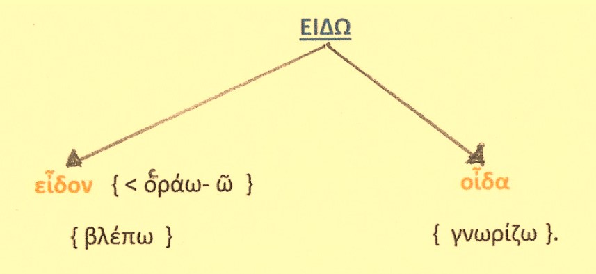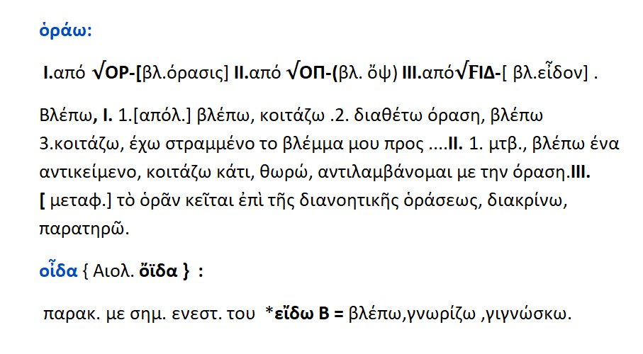 Το ορώ και το οίδα σχετίζονται ως ρήματα γνώσεως. Το μεν ορώ μεταφορικά τίθεται επί της διανοητικής »οράσεως» , το δε οίδα σχηματίζει τους παρελθοντικούς χρόνους από το γιγνώσκω.