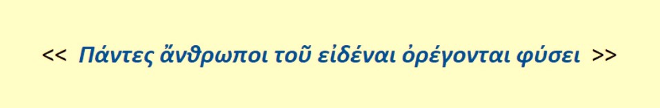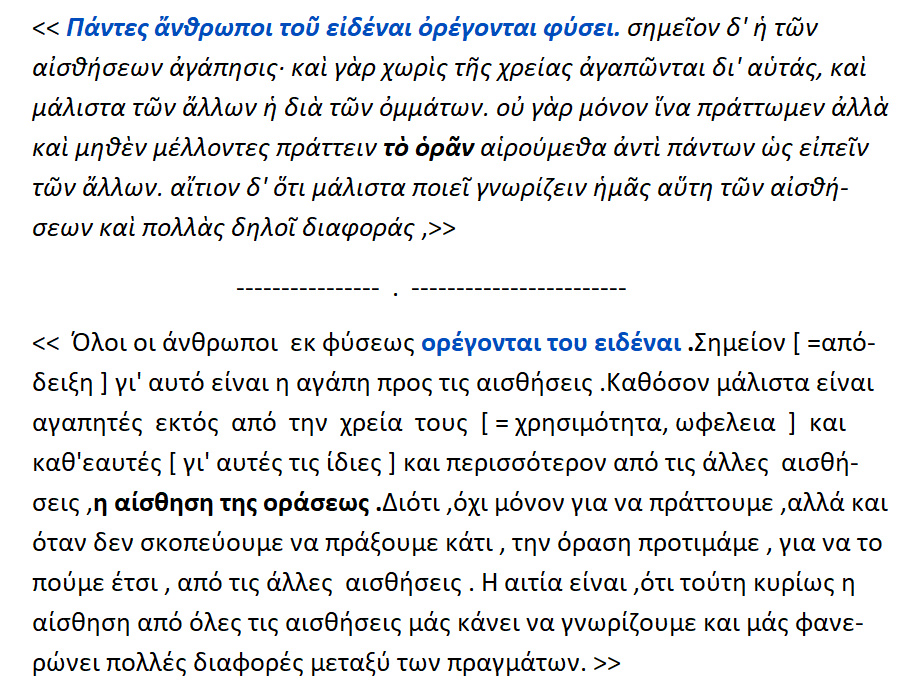 Ας πάρουμε για παράδειγμα την παρακάτω πρόταση , η οποία αποτελεί την εισαγωγή στο έργο »Μετά τα Φυσικά »του Αριστοτέλους :