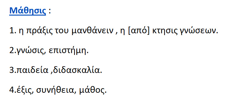 Σύμφωνα με τον Αριστοτέλη ,η μάθηση δεν είναι μία απλή απόκτηση γνώσεως κάποιου αντικειμένου , αλλά συμμετο-χή και επικοινωνία με το πράγμα , προς το οποίο κατευθύνεται η γνωστική μας ενέργεια .Επομένως η μάθηση δεν εί-ναι μία λεπτή νοητική εκδήλωση ή μία νοησιοκρατική έκφραση,αλλά μία ενεργός μέθεξη σε ό,τι προσεγγίζουμε διαμέ-σου αυτής. Μανθάνω σημαίνει ,λοιπόν, μετέχω διά παντοίων τρόπων σ’ αυτό το πράγμα που απευθύνεται η γνώση και εξ αιτίας δε της συμμετοχής αυτής στο πράγμα, το οποίο είναι το αντικείμενο της γνώσεως ,αισθάνομαι ηδονή [χαρά].