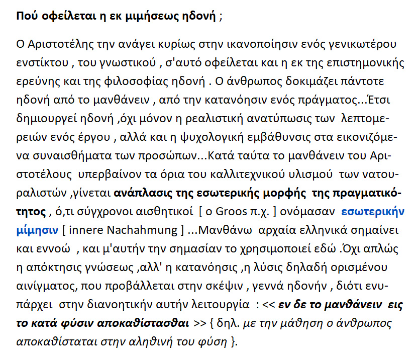 I.Ο Αριστοτέλης εκφέρει με κάθε επιφύλαξη ‘‘εοίκασι » [ έοικα = είμαι όμοιος, φαίνομαι όμοιος // παρακ. με σημασία ενεστ. < είκω } Ως υπόθεση ,όπως θα λέγαμε σήμερα , την γνώμη του περί της αρχής της ποιήσεως Οι αρχές της ποιήσεως είναι φυσικές όχι υπερφυσικές , όπως η μυθική παράδοση περί ορισμένου Θεού [ Απόλλωνος ,Ερμού , Μουσών ] ή ήρωος [ Ορφέως , Λίνου κλπ.] ο οποίος εφεύρε την ποίηση , ή η πεποίθηση περί της θείας μανίας , η οποία κάμνει κάποιον ποιητή [ Πλάτων , Δημόκριτος ]. II.Οι δύο αιτίες της ποιήσεως είναι : α]. το μιμείσθαι ,δηλαδή το ένστικτο της μιμήσεως ,όπως λέμε σήμερα β]. το χαίρειν τοις μιμήμασι, δηλ. ,ότι όχι μόνον ο μιμούμενος ευχαριστείται με την ενέργειά του να μιμείται [ όπως συμβαίνει στο παιχνίδι , όπου την ηδονή δημιουργεί αυτή η ίδια η ενέργεια του σώματος και της ψυχής , και μόνον αυτή ], αλλά και οι άλλοι ευφραίνονται με τις απομιμήσεις του.. Αυτοί οι δύο παράγοντες της καλλιτεχνικής ζωής , είναι η αρχή της μιμήσεως από την άποψη αυτού που δημιουργεί και από την άποψη αυτού που απολαμβάνει το καλλιτέχνημα.
