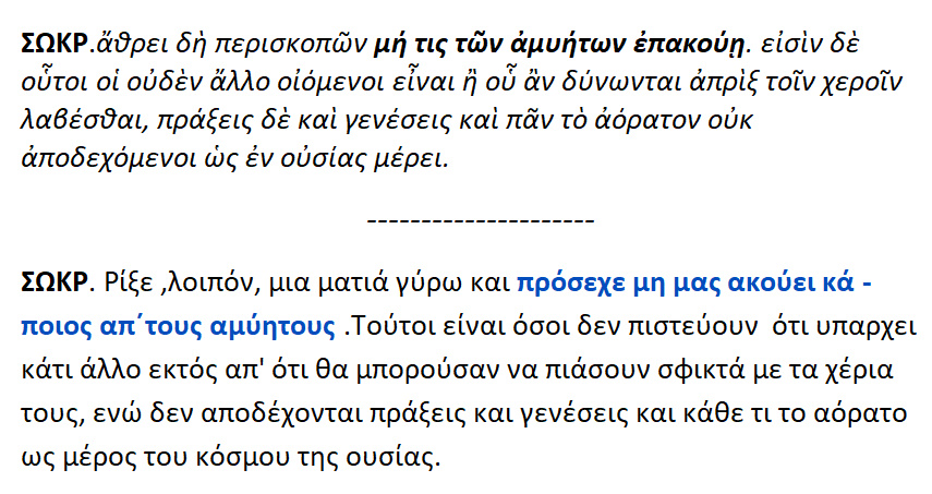 Τα ακόλουθα είναι μόνο για τους μυημένους .Δηλαδή αυτούς ,που όταν τα διαβάσουν , [ ανα]γνωρίζουν πράγματα εξ-ειδικευμένα περί της αρχαίας ελληνικής γραμματείας . Μυημένος χαρακτηρίζεται όποιος αντιλαμβάνεται ή κατέχει την ειδική γλώσσα , ώστε να κατανοεί τα σύμβολα και το απορρέον νόημα .Πραγματικά αμύητοι είναι οι αδαείς και οι ημιμαθείς ,που νομίζουν ότι είναι ειδήμονες [ διπλή άγνοια ]. Μία μορφή μυήσεως είναι και οι Φιλοσοφικοί Μύθοι ,όπως οι Λογικοί Μύθοι του Πλάτωνος. Αυτούς δεν μπορεί ο καθένας , ούτε είναι ορθόν και πρέπον , να τους αποκω-δικοποιήσει ,παρά μόνον εξειδικευμένοι δάσκαλοι .