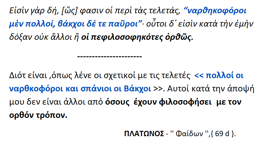 Διότι στις τελετές [ προς τιμήν του Βάκχου Διονύσου ] πολλοί μεν είναι αυτοί που κρατούν τους νάρθηκες [ νάρθηξ : φυτό, του οποίου τα στελέχη χρησίμευαν σαν ράβδοι (θύρσοι) των πανηγυριστών του Διονύσου ] , παύροι [ = ολίγοι ] δε οι Βάκχοι [ οι ένθεοι και ένθερμοι θιασώτες του Βάκχου, οι πραγματικοί λατρευτές ,που βρίσκονταν σε κατάσταση ιεράς μανίας , έξαψης ].