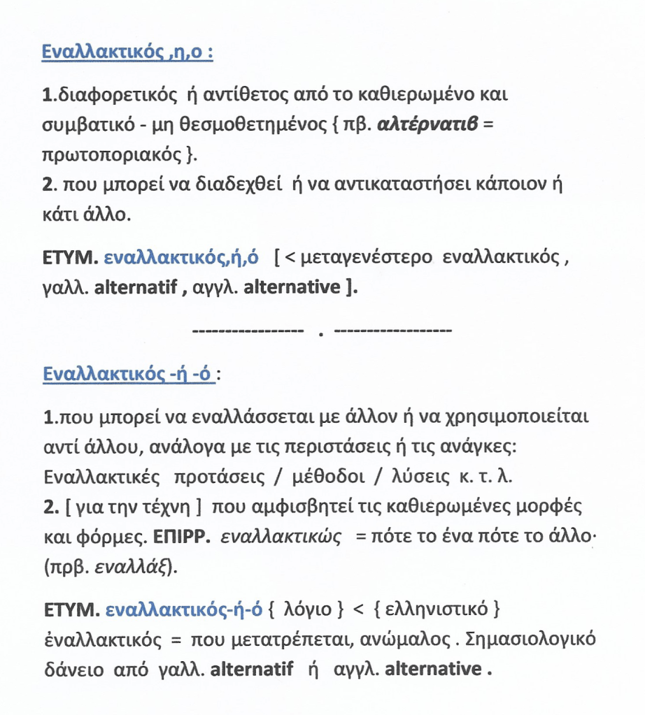 Τα δύο αυτά Νεοελληνικά λεξικά περιορίζονται στο να καταδείξουν ,ότι το επίθετον εναλλακτικός ,η, ον προέρχεται από το ελληνιστικόν εν-αλλακ-τικός = αυτός που εναλλάσσει κάτι ή κάποιον , ανώμαλος [ ασελγής ] ,που έχει δεχθεί σημασιολογική επίδραση [ δάνειο ] από το γαλλ. alternatif ή από το αγγλ. alternative .Ετυμολογικά όμως δεν παρέ-χουν καμμία πληροφορία.