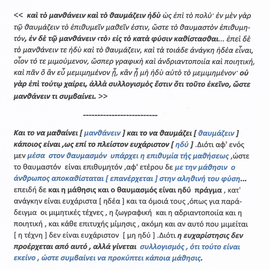 Kαι το μανθάνειν και το θαυμάζειν είναι ηδύ .Διότι μέσα στον θαυμασμόν υπάρχει η επιθυμία τής μαθήσεως ,ώστε το θαυμαστόν είναι επιθυμητόν , και με την μάθηση ο άνθρωπος αποκαθίσταται στην αληθινή του φύση…