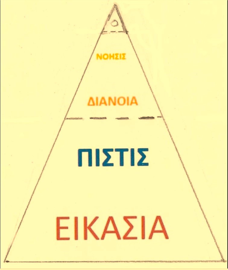 Το ένα είναι η γνωστική λειτουργία , που αναφέρεται στα ορατά και αισθητά. Το δεύτερον είναι αυτό που αναφέρεται στα νοητά, δηλαδή στις ιδέες και τις θεμελιώδεις αρχές των επιστημών. Το πρώτο και κατώτερο τμήμα ,που ονομάζει ο Πλάτων γενικώς » δόξαν » ,υποδιαιρείται σε δύο μερικώτερα τμήματα , την εικασία και την πίστη. Το δεύτερον και ανώτερον τμήμα που ονομάζει ο Πλάτων επιστήμη και αλήθεια υποδιαιρείται και αυτό σε δύο μερικώτερα τμήματα ,την διάνοια και την νόηση . Από την διάνοια [ υποθετικός λόγος ] δεν είναι δυνατόν να φθάσει κάποιος στην νόηση [ Αν–υπόθετον ] παρά μόνον δια της ενοράσεως [ ενόρασις = η ικανότητα της άμεσης [ βιωματικής ] γνώσεως της ουσίας των πραγμάτων ,χωρίς την μεσολάβηση των αισθήσεων ή της διανοίας ]. Ο χωρισμός αυτός δεν έχει απόλυτη γνωσιολογικήν αξία, διότι χρησιμεύει κυρίως για την εποπτική περιγραφή των φαινομένων.