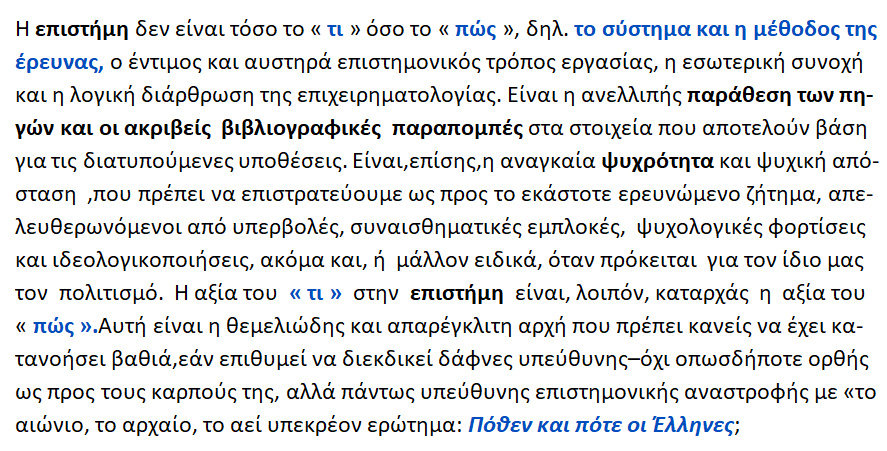 Από τα αρνητικά χαρακτηριστικά της εποχής μας – όπου όλα καταρρέουν εξ αιτίας της παρατεταμένης παρακμής και της προχωρημένης σήψης ,όπου την θέση του λογικού καταλαμβάνει το παράλογο και το παρά φύσιν αντικαθιστά το κατά φύσιν – είναι η αυξανόμενη ρευστότητα { το ευμετάβλητον , η αστάθεια } ,η γενική σύγχυση { η ασάφεια ,η αδυ-ναμία διακρίσεως των ορίων } ,η αμφισβήτηση των πάντων ,ο φόβος για το αύριο. Σύγχυση [ συν + χέω ] είναι το ανα-κάτεμα ανομοίων πραγμάτων ή λέξεων ή εννοιών ,κάτι που δυσκολεύει την αναζήτηση για το τί είναι αληθινό , βέβαιο ,πραγματικό .Σήμερα η έρευνα για την αλήθεια δεν πάσχει από ελλιπή πληροφόρηση , τουναντίον πάσχει από » υπερ-πληροφόρηση» και γενικευμένη παραπληροφόρηση. Ποία από όλες αυτές τις »πληροφορίες» , που κυκλοφορούν αδέ-σποτες παντού, είναι πράγματι πληροφορία [ = αυτή που φέρει πλήρως, η γεμάτη από κάτι ] ,που μπορεί να οδηγήσει στην γνώση ; Υπάρχει δρόμος ασφαλής εκτός από τον έλεγχο της αξιοπιστίας αυτών των »πληροφοριών» ή »γνώσεων» ,που προσφέρονται απλόχερα γύρω μας και ειδικά στο διαδίκτυο ; Όχι ! Η μόνη οδός αληθείας είναι η ανάπτυξη της κριτικής σκέψης ,η τέχνη του να διακρίνει κανείς το αληθές από το ψευδές και εν τέλει η μέθοδος της επιστημονικής έρευνας . Και διαφέρει η απλή έρευνα από την επιστημονική στο εξής : η απλή έρευνα δεν βασίζεται σε επιστημονική μέθοδο, επειδή δεν χρειάζεται να φτάσει σε βάθος , γι’ αυτό και δεν έχει ανάγκη αποδείξεων ‘ τα αντίθετον ισχύει για την επιστημονική. Η επιστημονική έρευνα για παράδειγμα στις κλασσικές σπουδές , προϋποθέτει την επαρκή γνώση της ελληνικής και λατινικής γλώσσας , την ικανότητα αναζήτησης και κριτικού ελέγχου των πηγών , την διασταύρωση των στοιχείων ,την ικανότητα διάκρισης των πλαστών από τα γνήσια χειρόγραφα , την χρονολόγηση , την αφαίρεση ενίοτε των συγγραφικών υπερβολών ή των μετέπειτα προσθηκών σε ένα κώδικα κ.τ.λ.