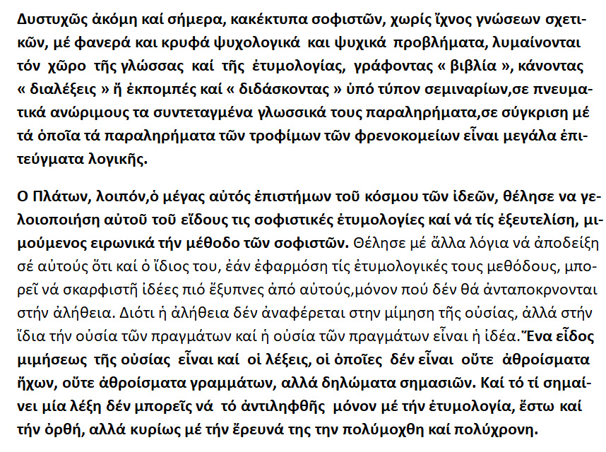 Προσοχή στα κακέκτυπα σοφιστών, που έχουν -εκτός από ημιμάθεια ή άγνοια – φανερά ή κρυφά ψυχολογικά ή ψυχικά προβλήματα και λυμαίνονται τον χώρο της γλώσσας και της ετυμολογίας, γράφοντας « βιβλία », κάνοντας « διαλέξεις » ή εκπομπές και « διδάσκοντας » υπό τύπον σεμιναρίων, σε πνευματικά ανώριμους τα συντεταγμένα γλωσσικά τους παραληρήματα για να τους ..»αφυπνίσουν’‘ με το αζημίωτο βέβαια!