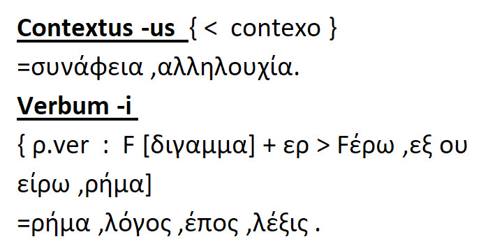 Contextus -us { < contexo } =συνάφεια ,αλληλουχία. Verbum -i = ρήμα ,λόγος ,έπος ,λέξις .