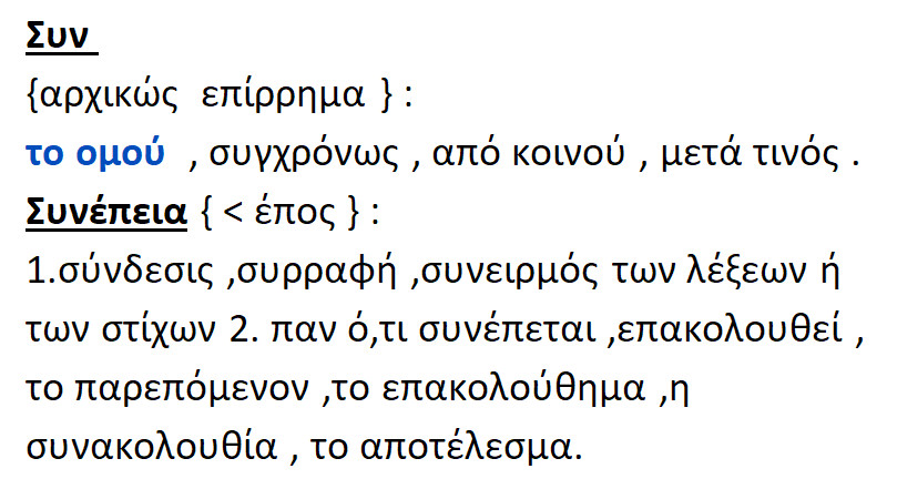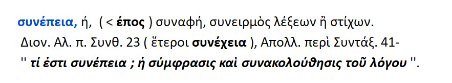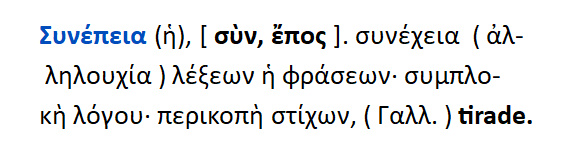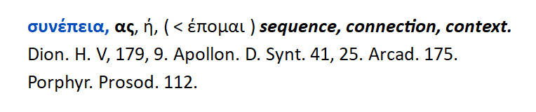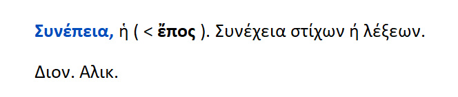 Συνέπεια { < έπος } = συνέχεια στίχων ή λέξεων.