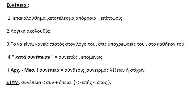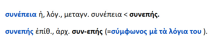 Συνέπεια : contextus verborum { = συνάφεια λόγων }. Μερικοί θεωρούν ,ότι συνάγεται από το » συν + έπομαι » και όχι από το » συν + έπος ».