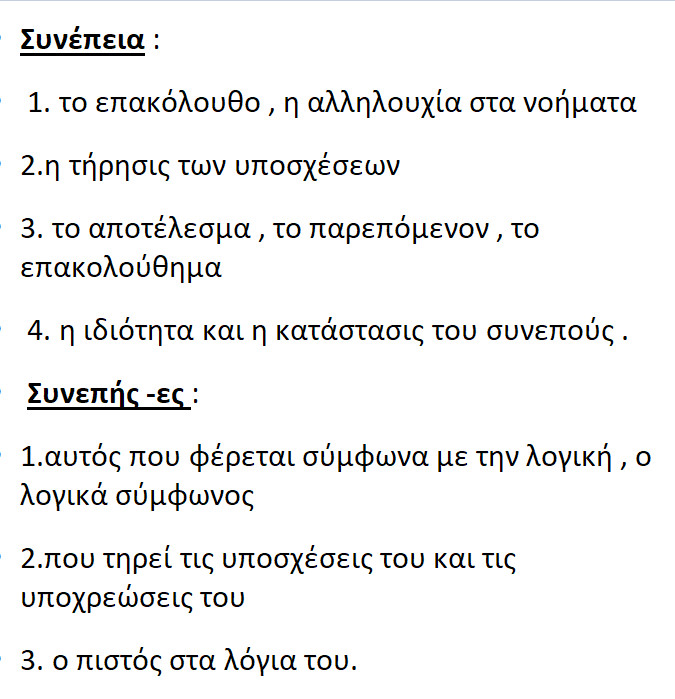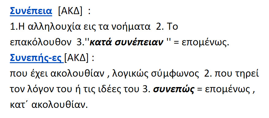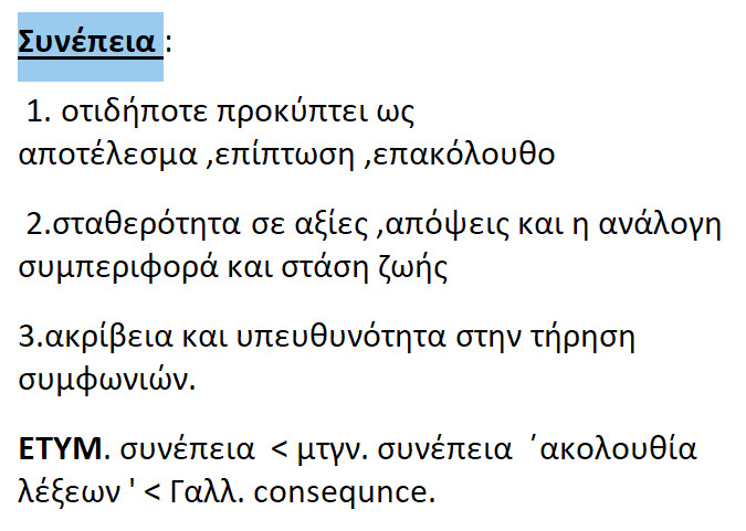 Συνέπεια [ΑΚΔ] : 1.Η αλληλουχία εις τα νοήματα 2. Το επακόλουθον 3.»κατά συνέπειαν » = επομένως. Συνεπής-ες [ΑΚΔ] : που έχει ακολουθίαν , λογικώς σύμφωνος 2. που τηρεί τον λόγον του ή τις ιδέες του 3. συνεπώς = επομένως , κατ΄ ακολουθίαν.