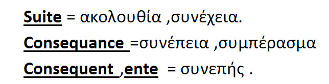 Suite= ακολουθία ,συνέχεια .Consequance =συνέπεια ,συμπέρασμα // en consequence =κατά συνέπειαν . Consequent ,ente = συνεπής // par consequent = συνεπώς , επομένως.