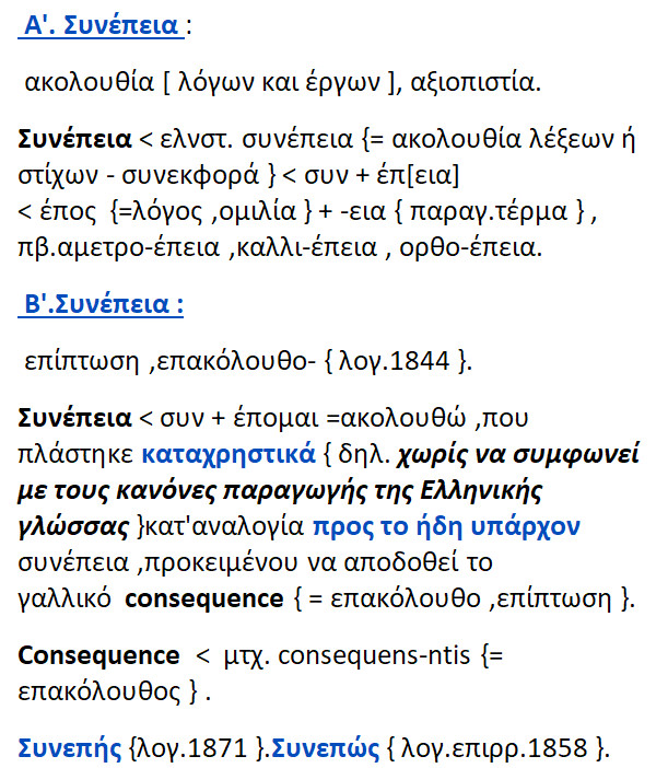 Α’. Συνέπεια = ακολουθία [ λόγων και έργων ], αξιοπιστία. Β’.Συνέπεια = επίπτωση ,επακόλουθο- { λογ.1844 }.