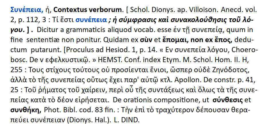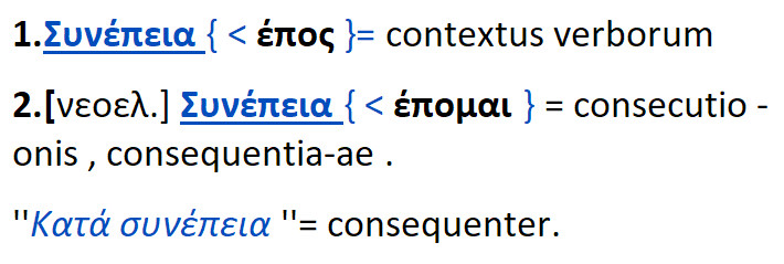 1.Συνέπεια { < έπος }= contextus verborum. 2.[νεοελ.] Συνέπεια { < έπομαι } = consecutio -onis , consequentia-ae . ‘Kατά συνέπεια »= consequenter.