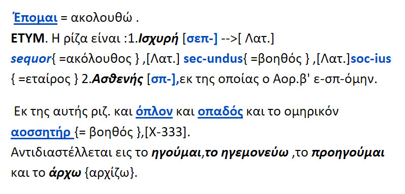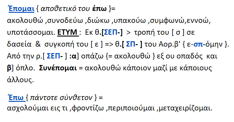 Έπομαι = ακολουθώ .ΕΤΥΜ. Η ρίζα είναι :1.Ισχυρή[σεπ-] –> Λατ.sequor ,Λατ. sec-undus{ =βοηθός } ,Λατ.soc-ius { =εταίρος } 2.Ασθενής [σπ-],εκ της οποίας ο Αορ.β’ ε-σπ-όμην. Εκ της αυτής ριζ. και όπλον και οπαδός και το ομηρικόν αοσσητήρ {= βοηθός },[Χ-333]. Αντιδιαστέλλεται εις το ηγούμαι,το ηγεμονεύω ,το προηγούμαι και το άρχω .
