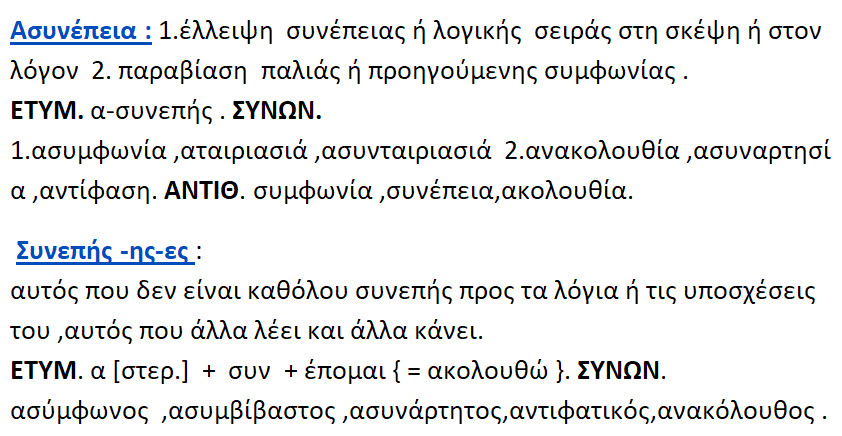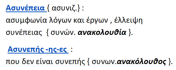 Ασυνέπεια : 1.έλλειψη συνέπειας ή λογικής σειράς στη σκέψη ή στον λόγον 2.παραβίαση παλιάς ή προηγούμενης συμφωνίας. Συνεπής -ης-ες : αυτός που δεν είναι καθόλου συνεπής προς τα λόγια ή τις υποσχέσεις του ,αυτός που άλλα λέει και άλλα κάνει.
