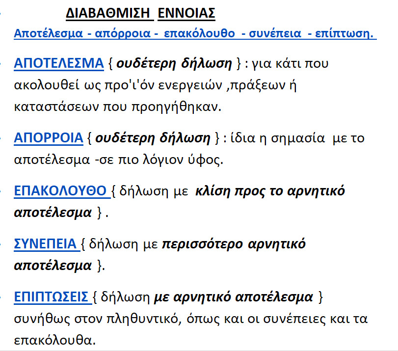 Αποτέλεσμα – απόρροια – επακόλουθο – συνέπεια – επίπτωση.