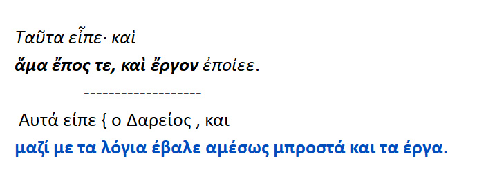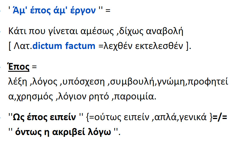 »Άμ’ έπος άμ’ έργον » – Κάτι που γίνεται αμέσως ,δίχως αναβολή . [Λατ]»dictum factum» =λεχθέν εκτελεσθέν.