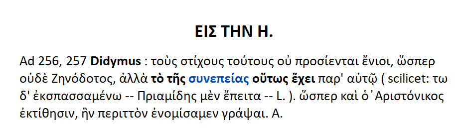 Δίδυμος [γραμματικός ] : << Τους στίχους τούτους ου προσίενται ένιοι ,ώσπερ ουδέ Ζηνόδοτος , αλλά το της συνεπείας ούτως έχει παρ’ αυτώ ,ώσπερ και ο Αριστόνικος εκτίθησιν >>.
