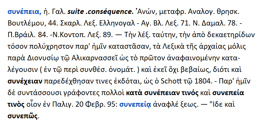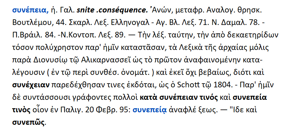 Συνέπεια { Γαλλ. suite ,consequence }. Tην λέξιν αυτήν ,την από δεκαετίες πολυχρησιμοποιημένη από εμάς ,τα Λεξικά της αρχαίας ελληνικής την καταγράφουν μόλις από τον Διονύσιον τον Αλικαρνασσέα ,επειδή { στο » περί συνθέσεως ονομάτων » } πρώτη φορά αναφαίνεται , και εκεί όχι με βεβαιότητα .Διότι παρεδέχθησαν κάποιοι εκδότες, ότι είναι συνέχεια και όχι συνέπεια ,όπως ο Schott.