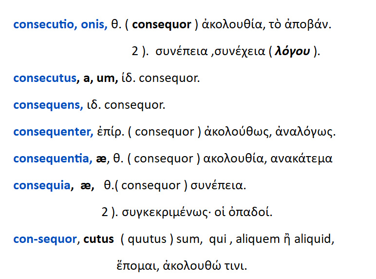 Con-sequor , sequutus { secutus } =ακολουθώ κάποιον ,συν-έπομαι .Consequia-ae =συνέπεια .Consequentia-ae = ακολουθία .Consecutio-onis =επακολουθία,συνέπεια.