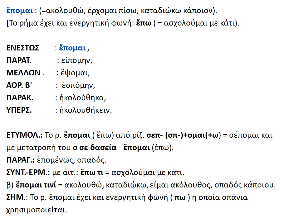 Έπομαι = ακολουθώ,έρχομαι ,καταδιώκω κάποιον. Ετυμολογία : Το ρ. έπομαι { έπω } < ρίζα ΣΕΠ- [ σπ ]+όμαι [ω] = σέπομαι {=>μετατροπή του [σ] σε δασεία } = έπομαι{έπω}. [Αλλαχού και Παρακείμ. ηκολούθηκα και Υπερσ. ηκολουθείκειν ,διότι δανείζεται τους χρόνους αυτούς ,ως ελλειπτικόν ρήμα }.