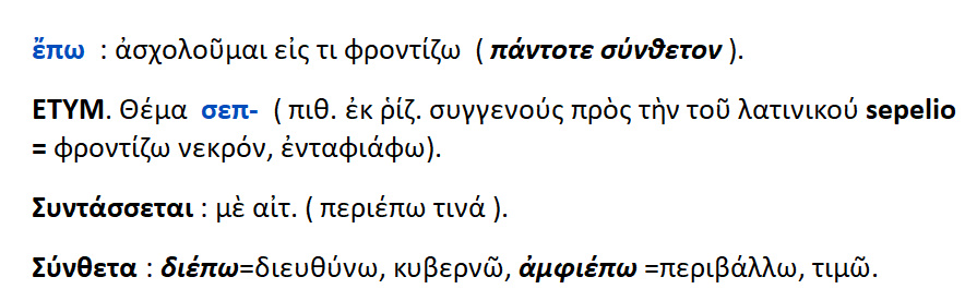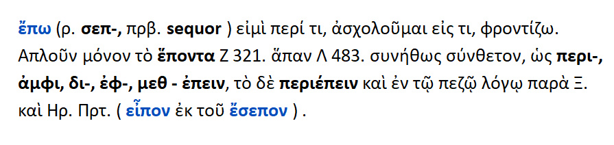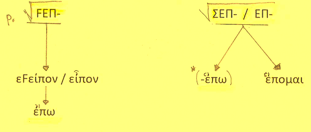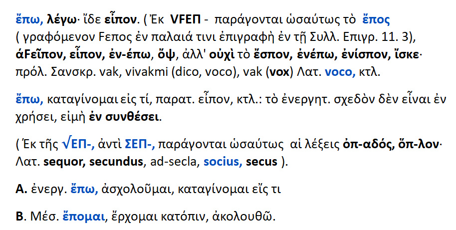 Α’.Έπω { < FΕΠ- } = λέγω. Β’.Έπω { < ΣΕΠ- / ΕΠ- } = ασχολούμαι ,καταγίνομαι εις τι. Έπομαι = έρχομαι κατόπιν ,ακολουθώ.
