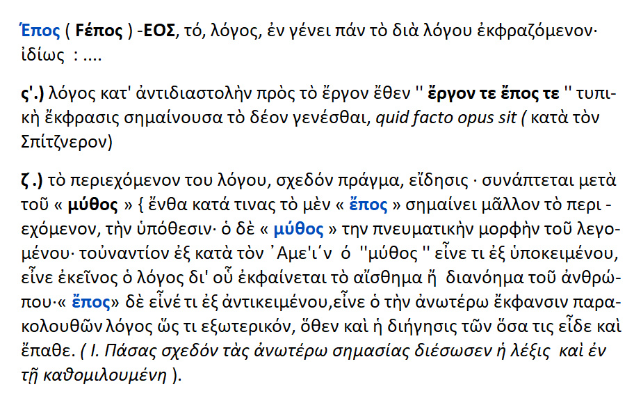 Έπος { Fέπος } : λόγος ,εν γένει παν δια λόγου εκφραζόμενον 1]. λόγος,υπόσχεσις 2].συμβουλή ,γνώμη 3]. χρησμός 4]. διήγησις ,άσμα αοιδού 5]. επιθυμία ,προσταγή 6].λόγος κατ’ αντιδιαστολήν προς το έργον 7].το περιεχόμενον του λόγου το οποίον συνάπτεται μετά του μύθου. Μερικοί θεωρούν ότι έπος μάλλον σημαίνει το περιεχόμενο ,την υπόθεση .Ο δε μύθος την πνευματική μορφή του λεγομένου .Τουναντίον άλλοι θεωρούν πως μύθος είναι κάτι το υποκειμενικό ενώ έπος κάτι το αντικειμενικό.