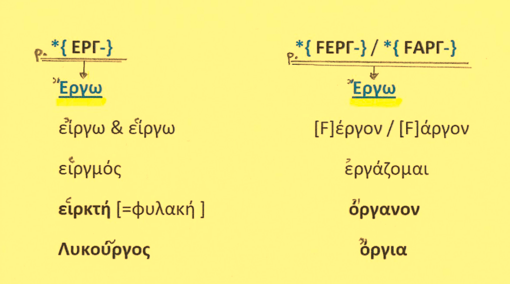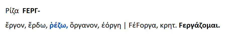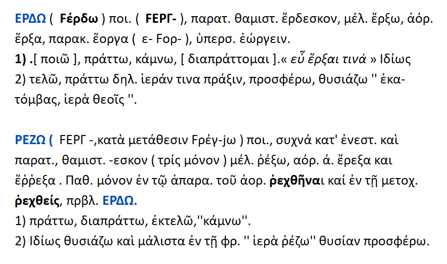 Έρδω { < Fέρδω } ποι.{ FΕΡΓ- } =1. ποιώ,πράττω, 2.τελώ, θυσιάζω. Ρέζω { < [Fεργ-],κατά μετάθεσιν [Fρέγ]-j-ω } = 1.πράττω,διαπράττω ,εκτελώ 2.θυσιάζω.