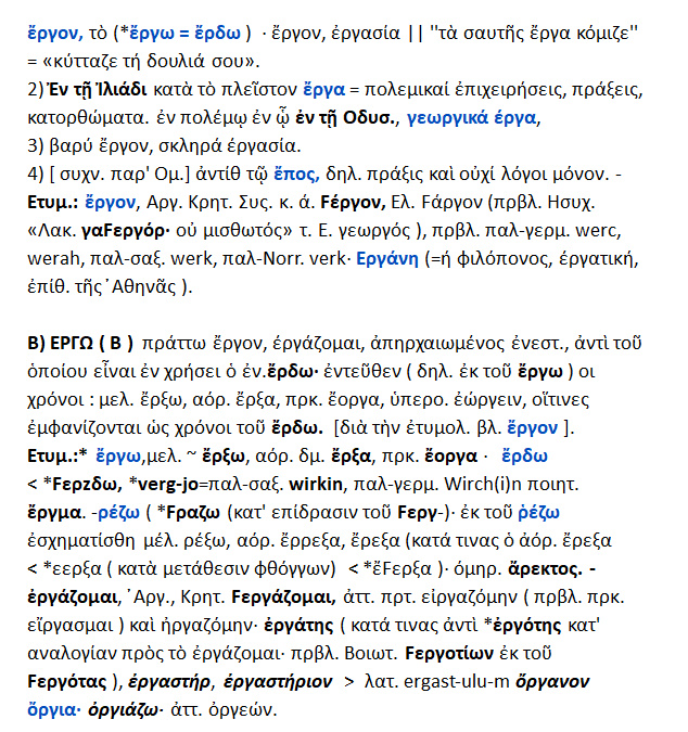 Έργον { < έργω [ Β ] = έρδω } =έργον ,εργασία. Έργω [Α] = εγκλείω,περιορίζω. Έργω [Β] = πράττω έργον , εργάζομαι.