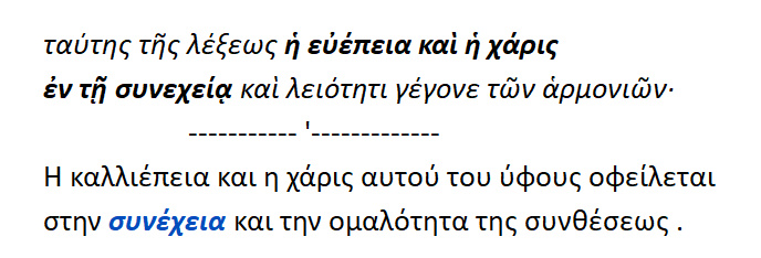 Η καλλιέπεια και η χάρις αυτού του ύφους οφείλεται στην συνέχεια { δ.γρ. συνέπεια }και την ομαλότητα της συνθέσεως .