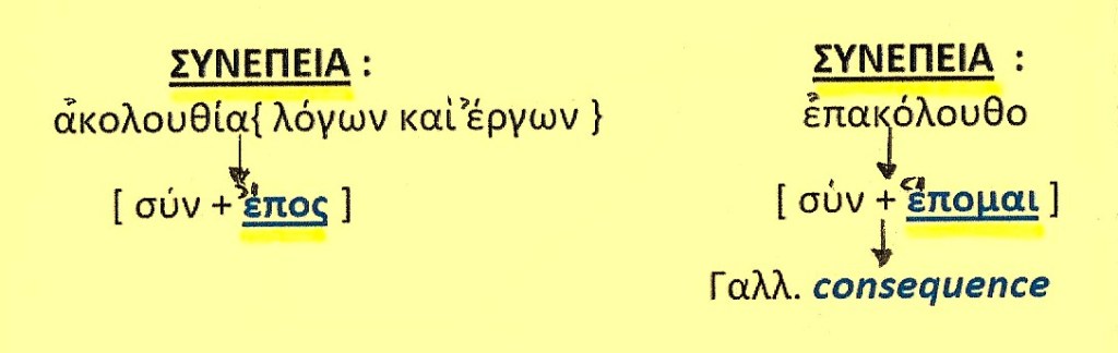 Συνέπεια { < έπομαι } : sequence { < Λατ. sequor } = τάξη, σειρά,αλληλουχία . Connection { < Λατ. connecto } = σύνδεση ,σχέση . Context { < Λατ. contexo } = συμφραζόμενα.