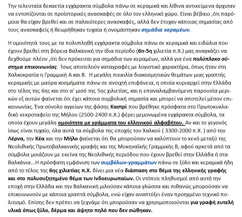 ΑΔ.ΣΑΜΨΩΝ : Νεολιθική περίοδος . Η πρόσφατη εμφάνιση των συμβόλων-γραμμάτων πάνω σε ξύλο και κεραμικά ήδη από το τέλος της 6ης χιλιετίας π.Χ. δίνει μια νέα διάσταση στο θέμα της ελληνικής γραφής και στο πολυσυζητημένο θέμα των Ινδοευρω-παίων.