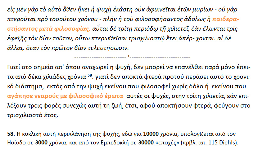 Η ψυχή εκείνου που φιλοσοφεί χωρίς δόλο ή εκείνου που αγάπησε νεαρούς [ παιδεράστησε ] με φιλοσοφικό έρωτα αποκτά φτερά μετά από 3.000 χρόνια [ για να επανέλθει στο σημείο απ’ όπου αναχώρησε ].